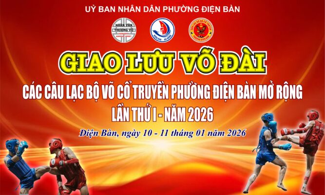 Tin mớiGiải “Võ đài các câu lạc bộ Võ cổ truyền phường Điện Bàn mở rộng – năm 2026” Posted on 03/12/202504/12/2025 by Tổ Đường Võ Kỳ Sơn Thời gian: Ngày 10 và 11 tháng 01 năm 2026. Địa điểm: Công viên Thanh niên Điện Bàn, đường Trần Nhân Tông, Phường Điện Bàn, TP. Đà Nẵng Điều lệ Giải: Download tại ĐÂY Đăng ký: từ 10 – 15/12/2025 Link đăng ký ONLINE: ĐÂY BTC KỲ THI THĂNG CẤP ĐAI VÕ CỔ TRUYỀN VIỆT NAM – TỔ ĐƯỜNG VÕ KỲ SƠN